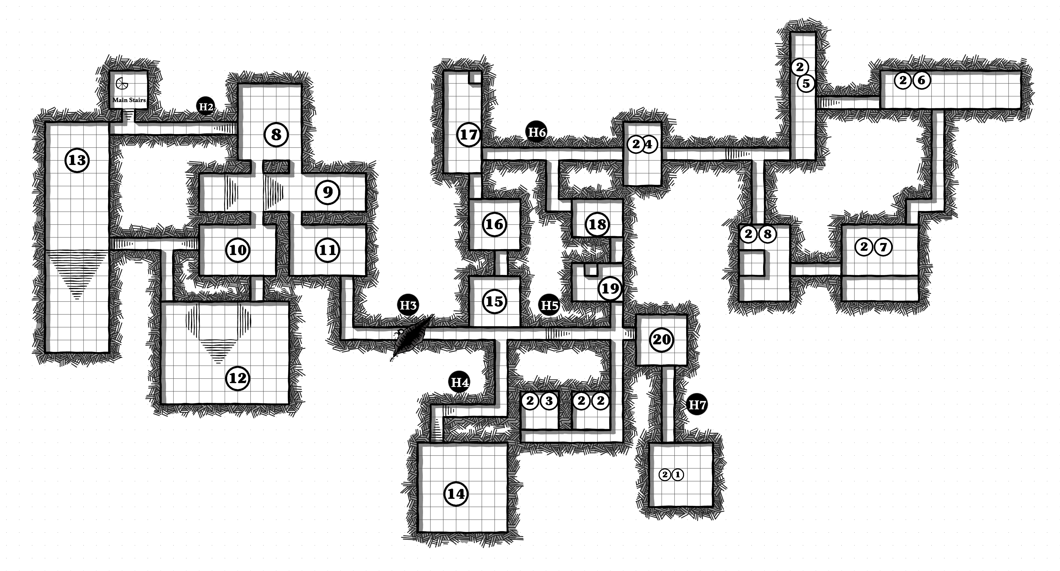 Many kobolds and a couple goblins fight over the water contained in the cistern. The kobolds are looking for the goblin who sabotaged their water supply. The goblins are fleeing a bad situation with their tribe. Part of the ceiling has collapsed creating partial cover and difficult terrain. A secret door in the southwest corner reveals a secret staircase that goes up and down one floor each.