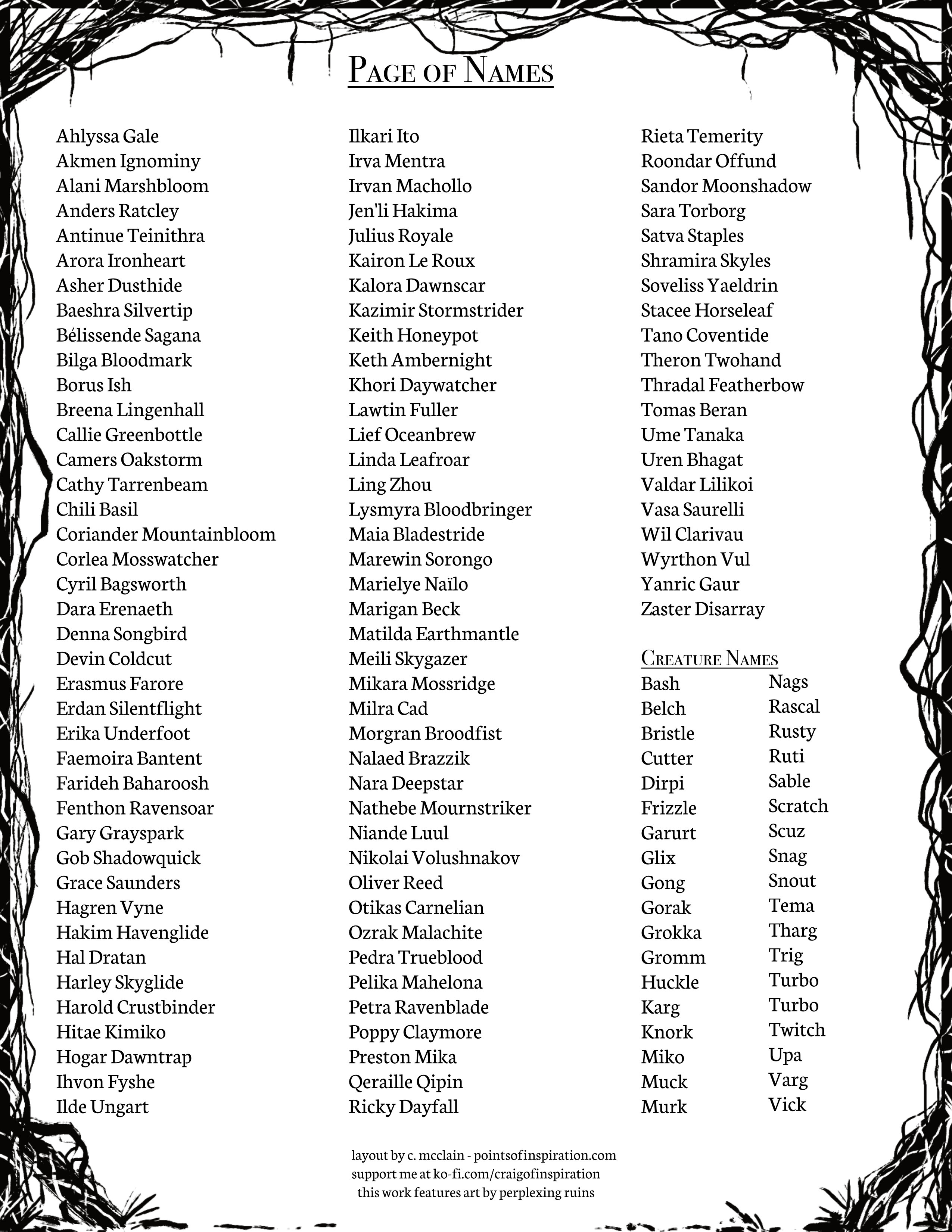If you’re like me you have a hard time coming up with names off the top of your head. So I put together a Page of Names that has over 100 names for you to use. Feel free to use these in the middle of a session, or while you are planning. Not only are they useful for D&D, but also for other TTRPGs like Shadowdark, Tales of the Valiant, and Daggerheart.